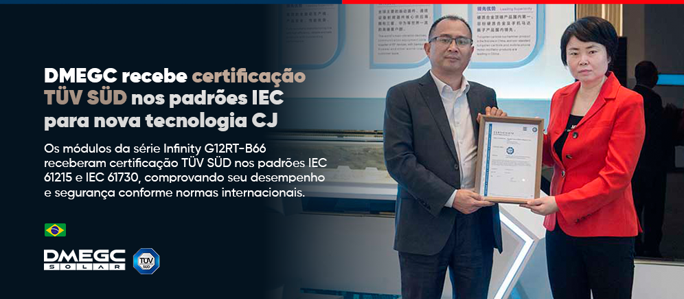 No dia 3 de novembro, a fabricante Tier 1 DMEGC Solar recebeu os mais recentes certificados IEC 61215 e IEC 61730 emitidos pela certificadora TÜV SÜD. A nova certificação abrange os módulos fotovoltaicos de ultra-alta potência, produzidos com as mais avançadas tecnologias desenvolvidas pela marca.